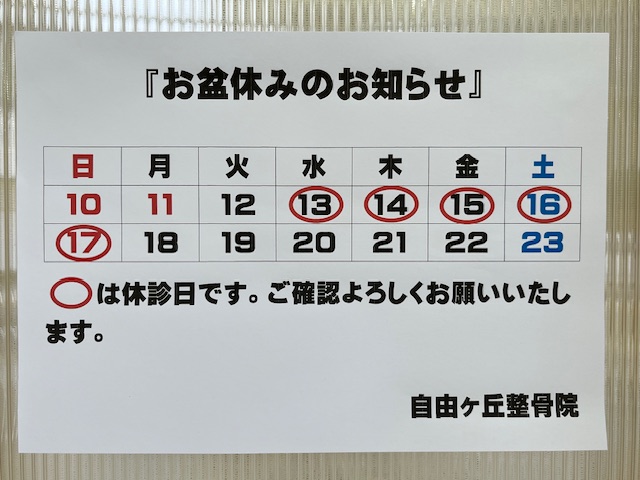 誠に勝手ながら、8月13日(水)〜17日(日)まで休診とさせていただきます